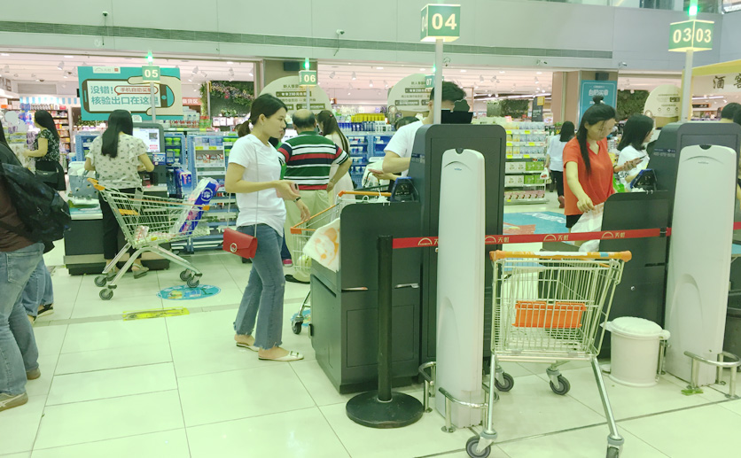 深圳の普通のスーパーマーケットで買い物をしたのですが、6~7台あるレジのうち、現金やクレジットカードを使えるのが一台だけ。