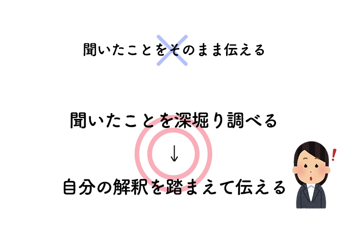 そのため、プレゼン後の質疑応答で講師の話になかった部分について質問されたときに回答することができませんでした。深い部分まで調べて自分の知識としてストックし、考察したり解釈したりするプロセスがあれば、先輩のように説得力のある伝え方ができたはず...!