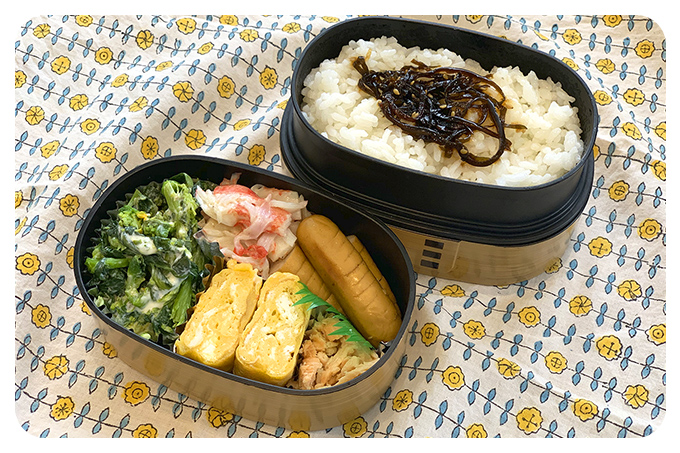菜の花は祖母の畑で採れたもので、春らしさを取り入れたのがポイントです♪またカニカマは彩りをプラスできてお弁当にとても優秀だと思いました!
