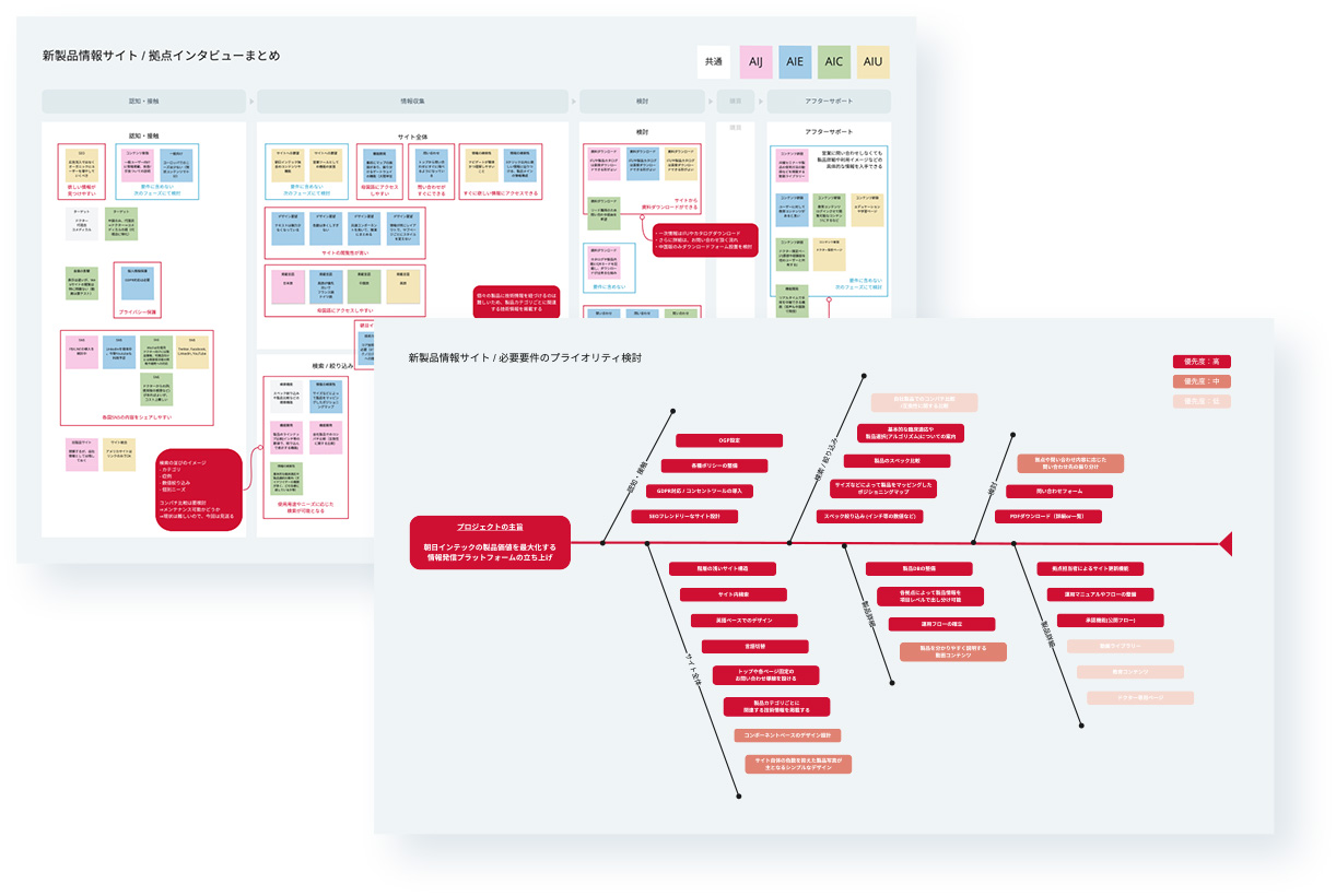 具体的なサイトのコンテンツや機能を組み立てるにあたって、朝日インテック様の主要エリアであるヨーロッパ、中国、日本、アメリカの担当者へインタビューを実施。「各拠点の課題」や「その拠点ごとに存在するユーザーニーズ」を抽出しました。