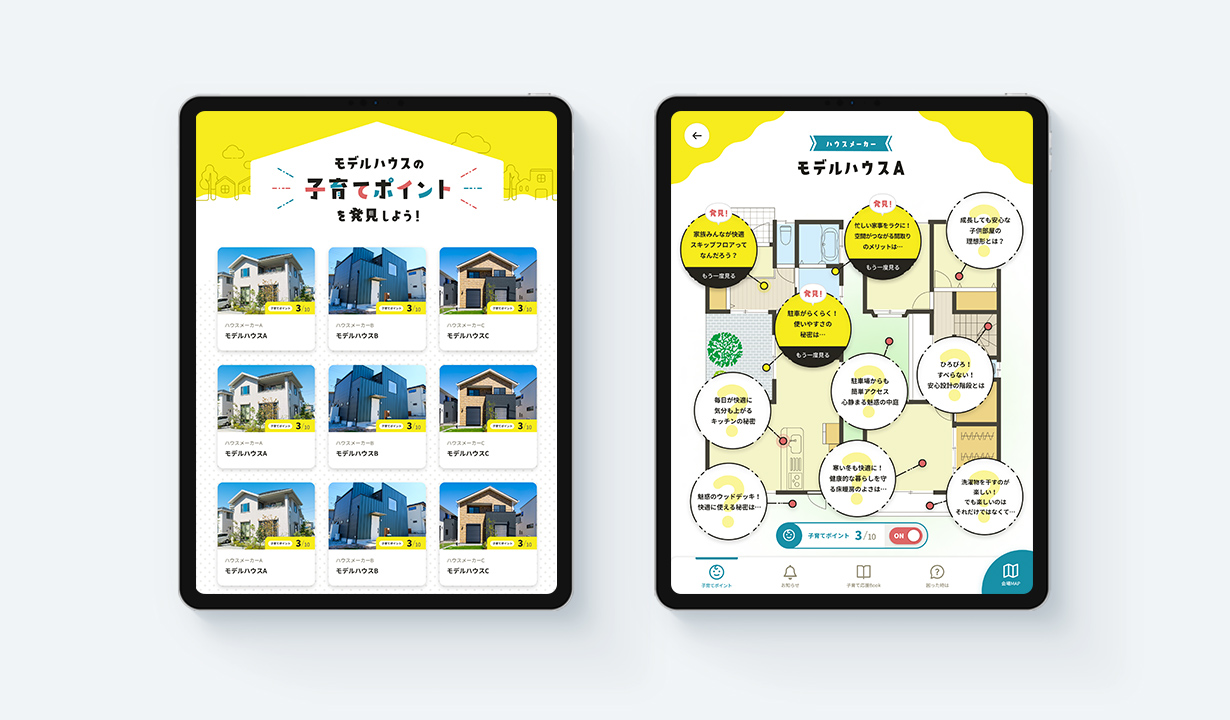 住宅展示場をナビゲートするビーコンを活用したタブレットアプリの開発と、現地取材による地域特性に特化したデジタルブックをリリースしています。
