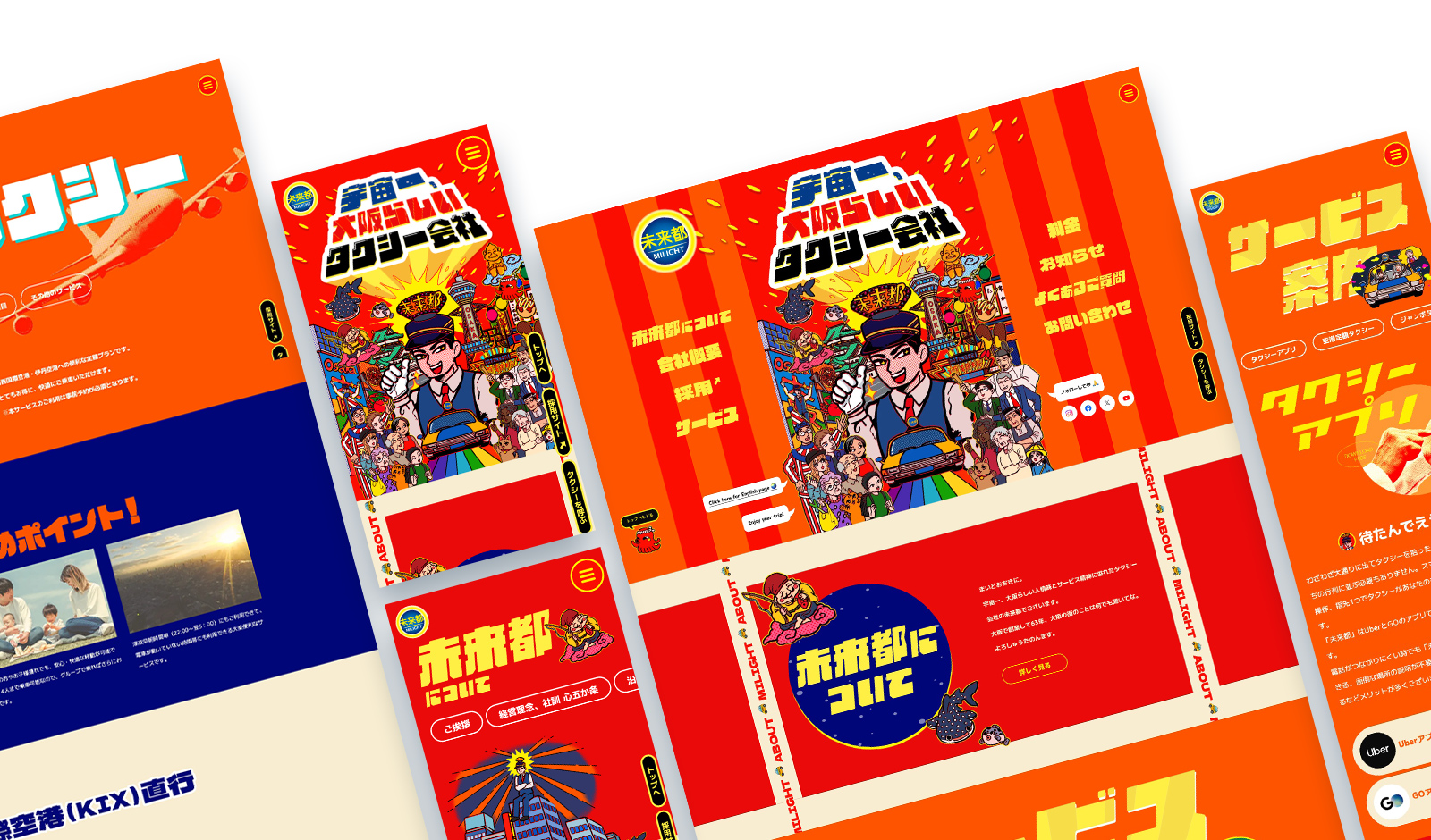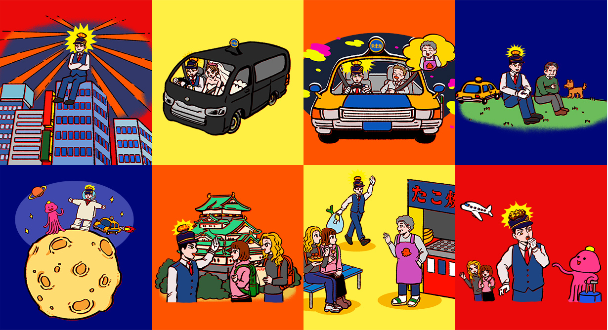 大阪を中心に展開し、地域での血の通った温かいコミュニケーションを大切にする未来都タクシー。数あるタクシー会社との差別化を目指し、キャッチコピーである「宇宙一、大阪らしいタクシー会社」を基軸に、ユーモアと人情味を凝縮した大阪らしいコテコテな世界観を演出しました。若者をターゲットに、そのコピーに負けないモダンかつインパクトあるイラストや、バラエティ豊かなタイポグラフィを散りばめ、独自性あふれるブランドアイデンティティを表現しました。