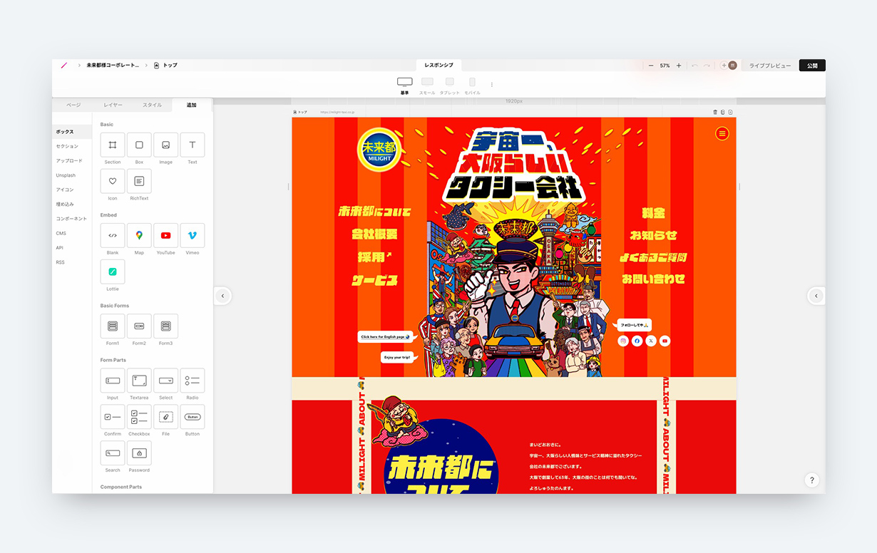 「宇宙一、大阪らしいタクシー会社」をグラフィカルに表現したWebサイト