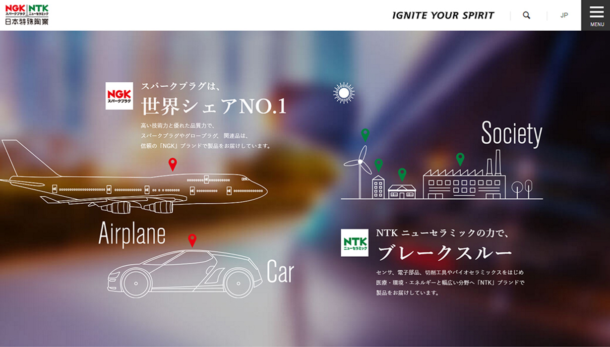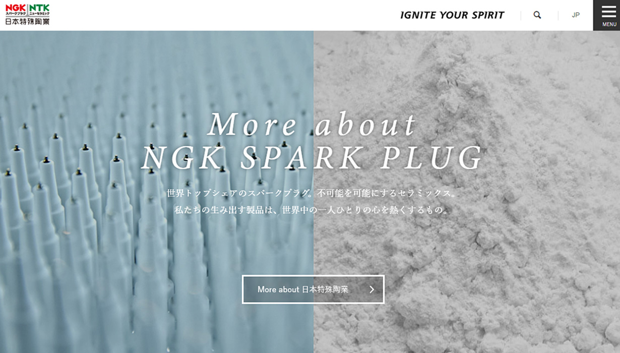 ブランド再構築にあたり、Webサイトリニューアルと並行してコーポーレートメッセージを策定。日本特殊陶業様80周年プロジェクトチームとしてアクアリングも参画しました。策定にあたり、従業員の皆様から案を募集。企業理念、80年の歴史、製品などを今一度振り返り、日本特殊陶業様の根底に流れるDNA、そして今後の“ありたい姿”への想いが込められた「IGNITE YOUR SPIRIT」というメッセージが生まれました。 さらに、コーポレートメッセージに込められた「未来をひらく革新的なものづくりで、世界になくてはならない企業を目指す」という想いを表現するバックグラウンドストーリーも合わせて策定しました。なお、コーポレートメッセージをグローバル企業として世界に発信するため、アクアリング・グローバルストラテジー参画のもと、英語版も同時に策定しています。