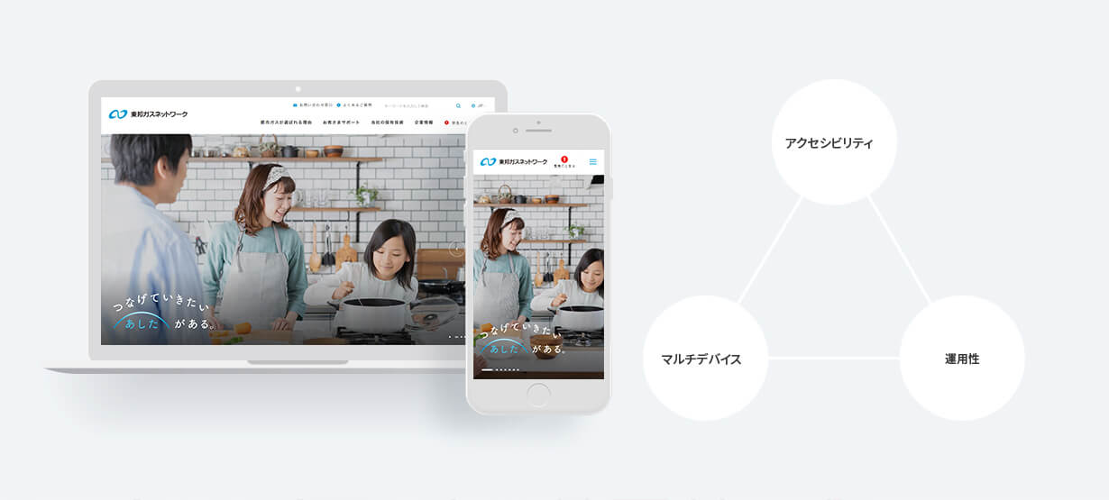 生活インフラを支える企業として、幅広いユーザーの利用シーンにおいて必要な情報を適切に届けることを考慮し、マルチデバイス対応、アクセシビリティ対応、強固で効率的な運用フローの確立の3つのポイントを切り口にサイトのUIを全面改修しました。